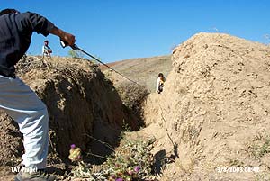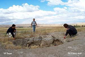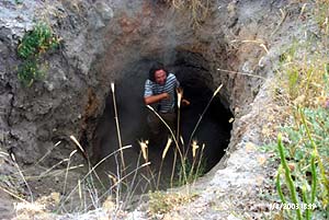 Sivas höyüklerinin bazılarının, kaçak kazı çukurları öylesine derin ki, bir tanesi bizim ekipten Serhan'ı yutuverdi. Uzun süre çıkmak için uğraşan Serhan, belgelendikten sonra, diğer ekip üyeleri tarafından kurtarıldı... (TAY -hangi koşulda olursa olsun- önce belgeler, sonra kurtarır!...) Merkez / Sivas / Türkiye |