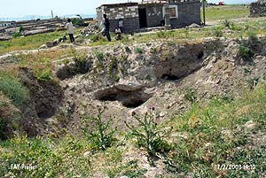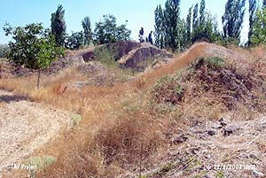 Bugüne kadar gördüğümüz, üzerinde en fazla defineci çukuru olan höyüklerden biri: Biz orada olduğumuz sırada 60'ın üzerinde saydık, belki şu sıralar 100'ü geçmiştir. Ayrıca bu İlk Tunç Çağı höyüğünün üzerine de bir köy yolu yapılmış. Civar köylerin sakinleri taş çıkarma ve toprak çekme bahanesiyle sürekli kaçak kazı yapıyorlar. Bir "sahipsiz kültür varlıkları" klasiği daha... Muradiye / Van / Türkiye |