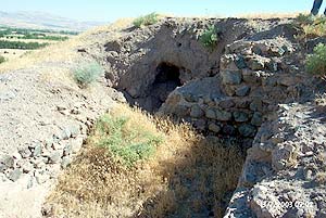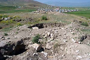 Kalecik köyünün evleri tepenin etrafını çevirmiş vaziyette ve Urartu dönemi kale kalıntısının çevresindeki höyükte sürekli define kazısı yapılıyor ve toprak alınıyor. Merkez / Van / Türkiye |