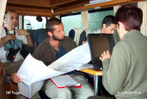 harıl harıl çalışmakta: Foto film makineleri temizlenmekte, ayarlanmakta; gidilecek noktalar son kez gözden geçirilmekte; bilgisayarlara giriş yapilmakta. 23/6/2000 |
